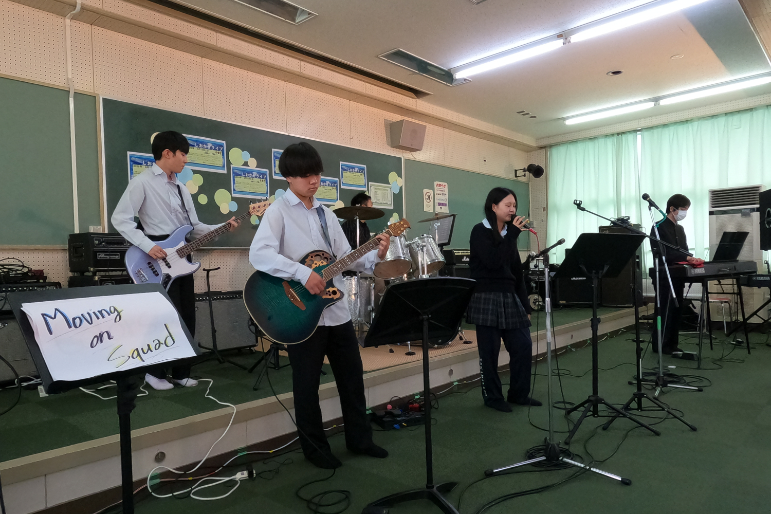 3.【Moving on sauad】 2年生バンドです。先に進むというイメージで付いた名前。今回はドラムに松永さん、ボーカルに○〇さん?と○〇先生を迎えて楽しい‟わ“ができましたね! 楽しかったです‼